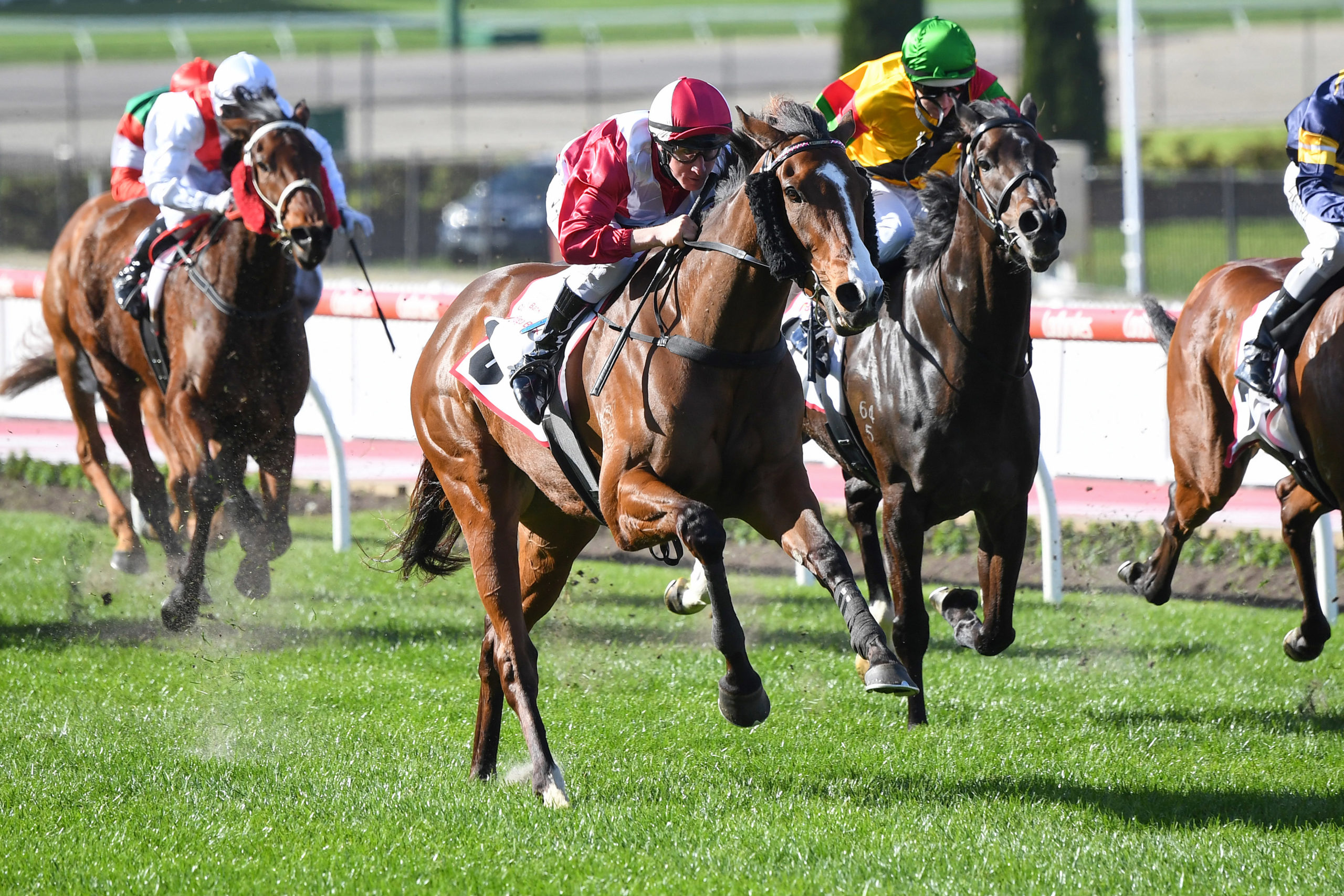 Reserved off the early speed in the small field, Showmanship built momentum before the home turn and swept home to defeat Felicia (Unencumbered) and Age Of Chivalry (Master Of Design). (pic: Racing Pictures/Pat Scala)