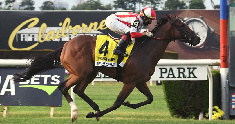 Irad Ortiz bounced Newspaperofrecord straight to the front and the four-year-old was never headed, clear into the home straight to eventually defeat Beau Recall (Sir Prancelot) by three lengths in the time of 1:35.62 for the trip. (pic: NYRA)